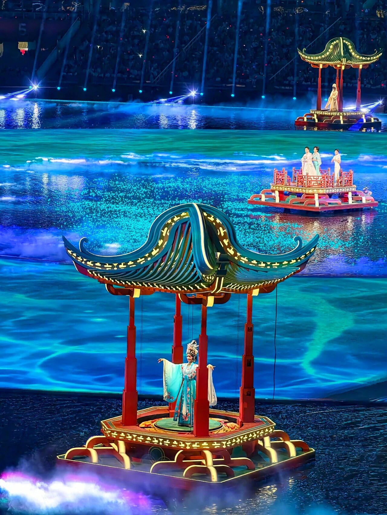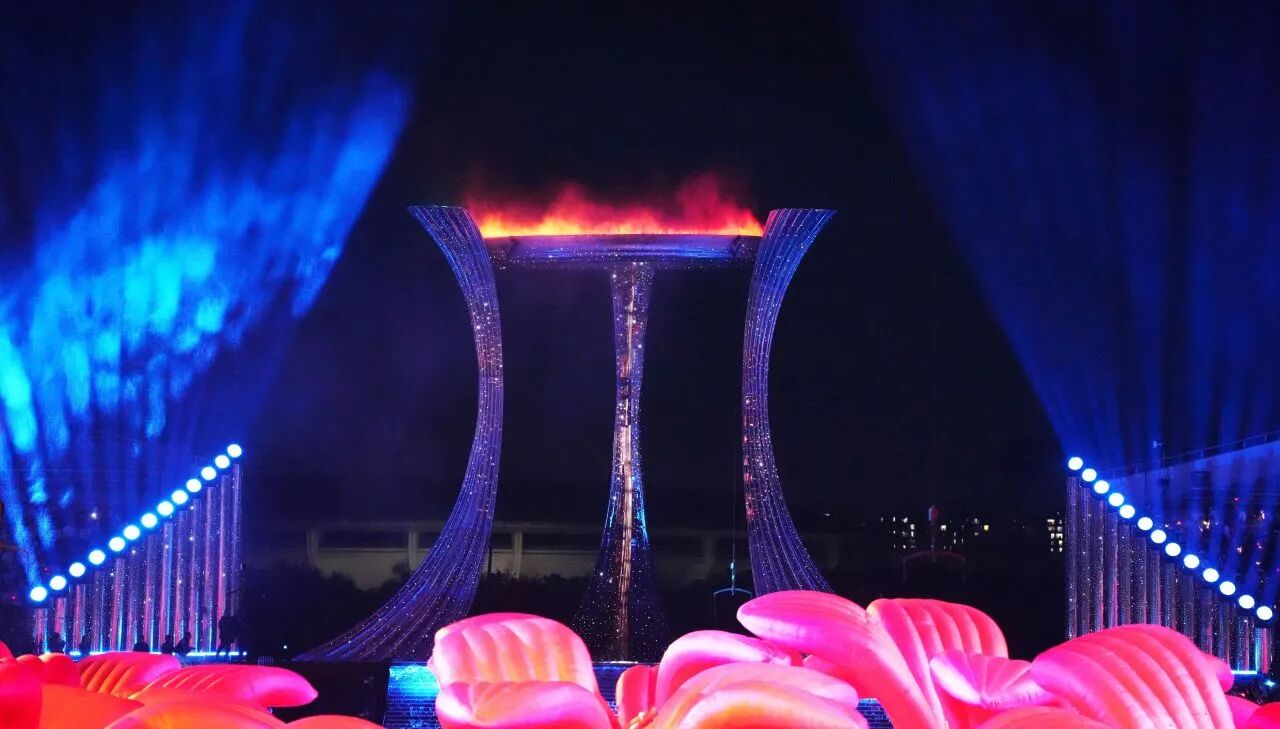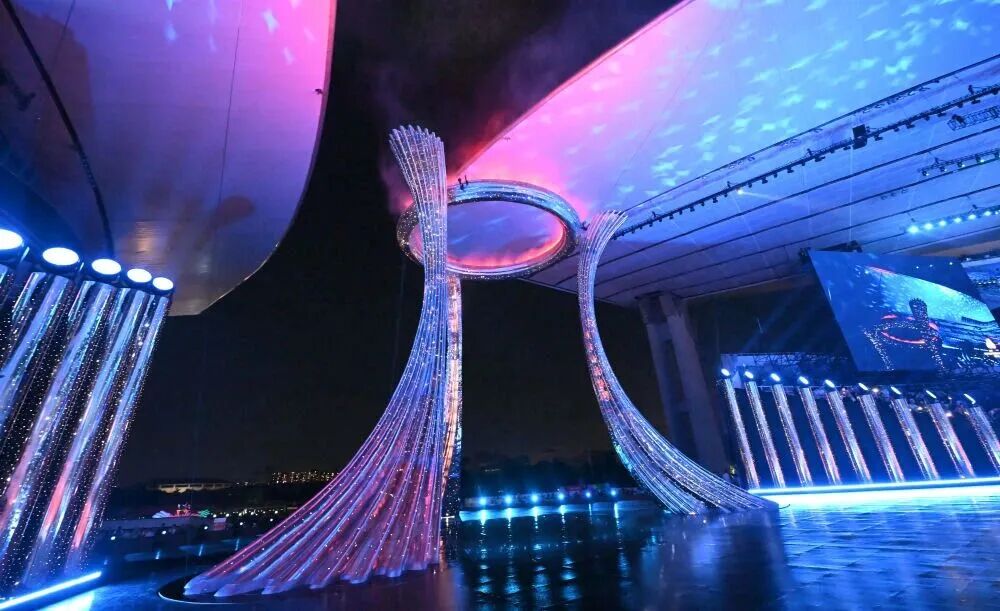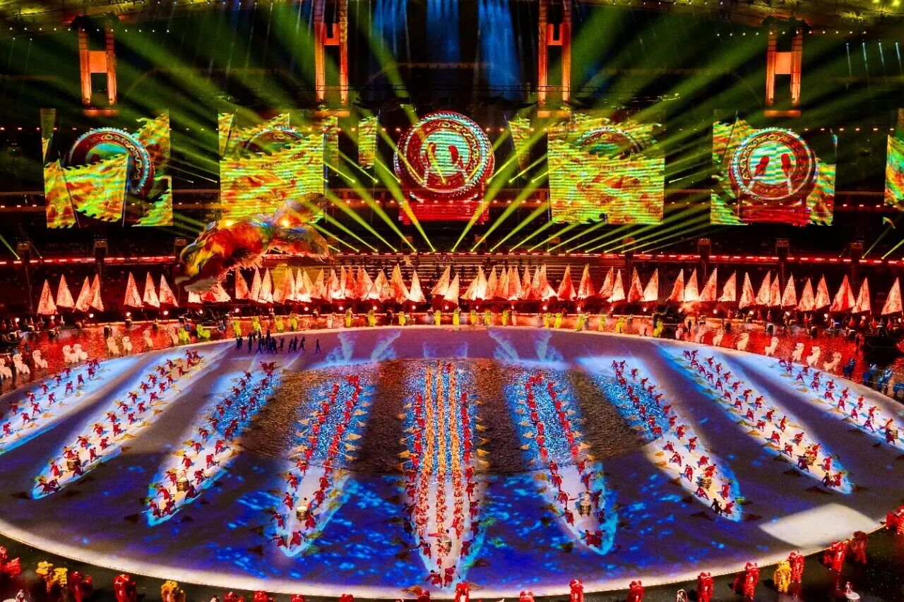 The opening ceremony, themed “Dreams Come True in the Future,” unfolded in three grand chapters: “Shared Roots and Origins,” “Shared Hearts and Bonds,” and “Shared Dreams and Fulfillment.” It ingeniously integrated concentric circles with a water stage, creating an ocean within the venue to vividly illustrate the interconnected cultural heritage of the three regions and one sea—all sharing common roots and origins.