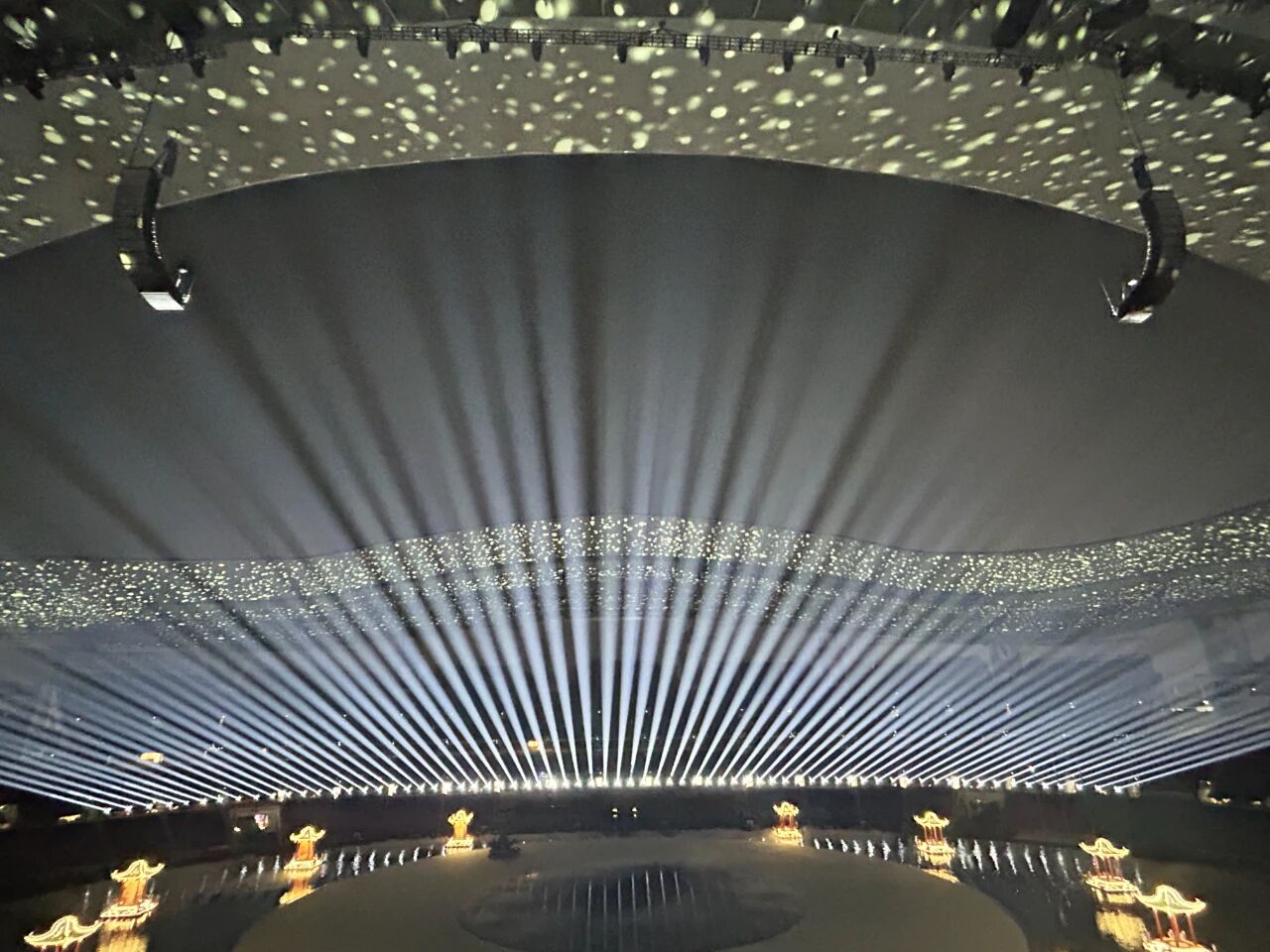 Simultaneously, the fixed-mounted V8 IP creates intricate pattern discs and prism effects along the venue's eaves. The ZB19X IP, equipped with 19 high-power 60W RGBW LEDs, delivers 21,000 lumens of highly saturated color washing to effortlessly illuminate the venue's vast space. Four hundred AK Storm Bars installed along the audience seating outline the spatial form. Paired with AK M Blast fixtures, they generate dynamic, dazzling colors through powerful strobing effects, effectively filling the visual void beyond the stage.